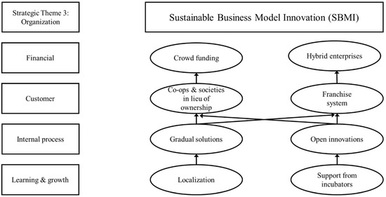 As depicted in Figure 4, organizational innovation for a sustainable business model requires learning and growth via localized management or incubator support. Localization and incubators facilitate open innovation and foster gradual solutions to internal procedural problems. As regards customers, the establishment of franchise systems helps in finding more people who share the same belief to join the movement. Co-ops and societies may be the new form of ownership, in contrast with the previous mainstream approach of shareholder ownership. Finally, collective effort or crowd funding may serve as a mechanism with which to develop hybrid enterprises.