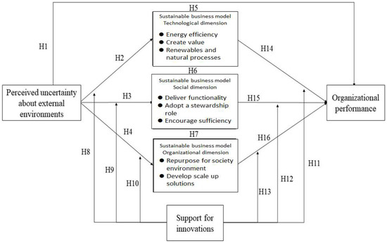 The relationship among perceived uncertainty about external environment, support for innovation, and sustainable business model innovation.