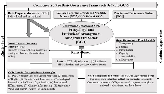 The study is based on an assorted set of variables to apply climate principle 1 against component 1 of the governance framework (GC-1) based governance model in the agriculture sector. Consultative meetings, as described under Section 2.1 above, helped in confining up to nine criteria and 43 indicators for legal, policy, and institutional arrangements (GC-1) [54] (see Figure 1).