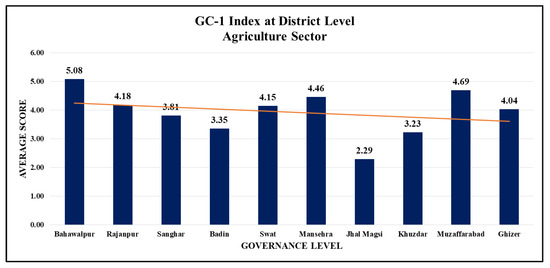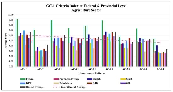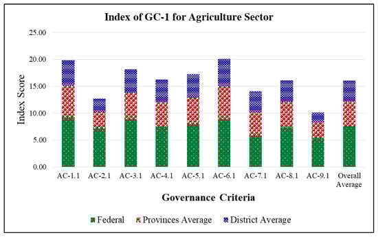 Disaster preparedness (AC 1.1) assessed GC-1 based on indicators of vulnerability assessment, including spatial mapping, Local Adaptation Plans of Actions (LAPAs), reducing GHG emissions, and an early warning system for disaster preparedness. The findings revealed that the governance components against the criteria are comprehensive and inclusive (Index Score 6.61) covering all four aspects as identified in the indicators of AC 1.1. The findings corroborate the fact that federal and provincial disaster risk management plans addressing structural and non-structural measures are in place and covers monsoon contingency plan to address flood protection and early warning for climate extreme events [66]. The second criterion (AC-2.1) is based on three indicators covering aspects of agricultural rights in the context of diverse geographical areas, for example, restricting the rights for agricultural intensification in the highly susceptible ecosystem, including mountain slopes and dry river belts. The criterion (AC-2.1) also addressed the need for capacity development of relevant stakeholders including the local communities. The average index score (4.23) revealed that considerable efforts have been made to regulate farmers’ rights. In the literature, it is opined that the regulation of rights, particularly land ownership, is important for the success of adaptive strategies as farmers opt to invest and enhance farming practices if they have ownership rights [67,68]. Besides that, the regulation of rights also impacts the farmers indirectly because many interventions, such as access to credit and crop insurance, are linked to land ownership.