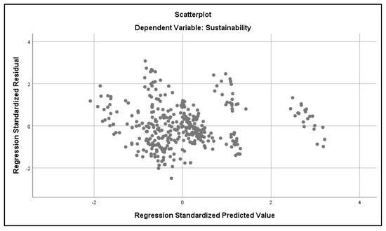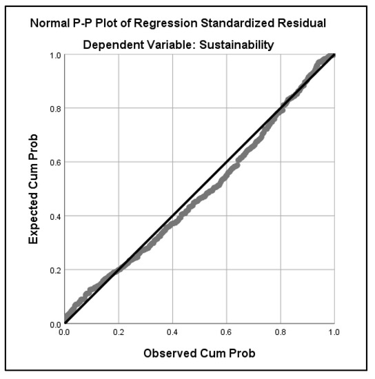 A strong correlation (1-tailed significance of 0.01) exists between all CCD criteria under GC-1; the summary is shown in Figure 5 and detailed SPSS output is given in File S2. However, the criterion for climate infrastructure (AC-7.1) has a weak correlation with the criteria for agriculture, water, and energy nexus (0.694) and regulation of rights (0.561). AC-7.1 has a very weak correlation (0.447) with AC-9.1 (sustainability). Multivariate regression analysis of the agriculture sector was carried out (SPSS output in File S2, Supplementary Material). For this purpose, the sustainability of the governance framework i.e., policies, laws, and institutions, is considered to be the dependent variable. For the linear regression model, values of R (0.915) and R Square (0.837) showed good variance. The t-test showed a significant relationship between the criterion of sustainability (AC 9.1) and the other eight criteria (above ±2) except the criterion of technological innovation (AC 4.1) for which the value was 1.561. Collinearity diagnostics (tolerance > 0.10 and VIF < 10) for criteria of climate-smart agricultural practices (AC-3.1) and climate organization (AC-5.1) did not show significance; all criteria except the criterion of climate infrastructure (AC-7.1) showed good zero-order correlations with the criterion of sustainability (AC-9.1). The normal P-P plot (Figure 6) presented results with little upward and downward fluctuations. The scatter plot (Figure 7) showed three, different groups, within the ±3 boundaries, except a very few outliers.