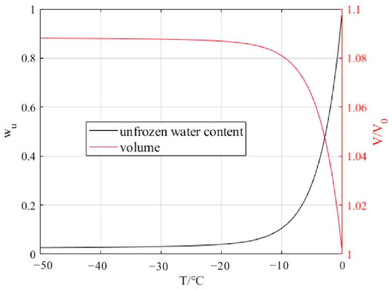 According to Equation (7), the water–ice conversion law can be obtained during the temperature change (see Figure 2). Water is completely liquid at temperatures around 0°, with an initial volume of V0. As the temperature decreases, the content of liquid water shows a sharp decline, with the content reducing to around 10% of the initial value at −10 °C, and gradually approaching the limit at around −20 °C. The water–ice conversion process is accompanied by volume expansion, which approaches a maximum at around −10 °C and is about 1.08 times the initial value.