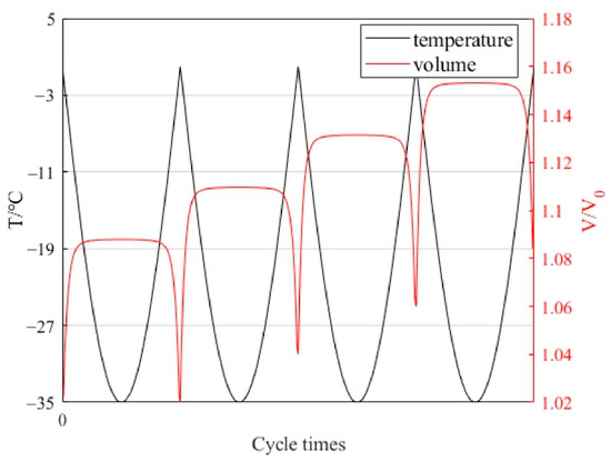 where represents the maximum volume of the freezing process determined by Equation (10); is the initial volume before the start of the i-th freeze–thaw cycle; and the initial volume before the start of the i + 1-th freeze–thaw cycle is:
