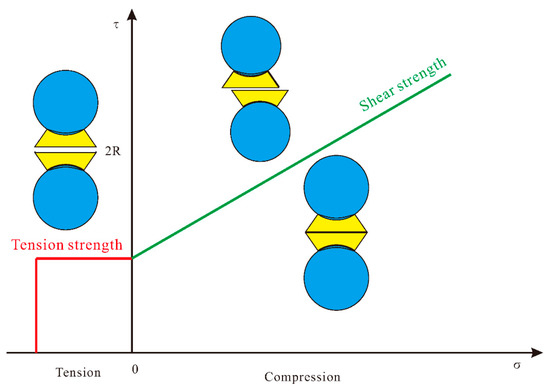 In this paper, the parallel bond model (PBM) [57,60,61] is chosen as the bond between minerals, and the strength pattern of the PBM when subjected to freezing and swelling forces conforms to the strength curve shown in Figure 4. Bond damage occurs when or , with tensile damage occurring in the former and shear damage in the latter. The analysis of bond damage types later in this paper will also be based on the damage types described in this section. Under the bonding–expansion coupling mechanism, each bond damage results in a change in pore volume of according to Equation (12).
