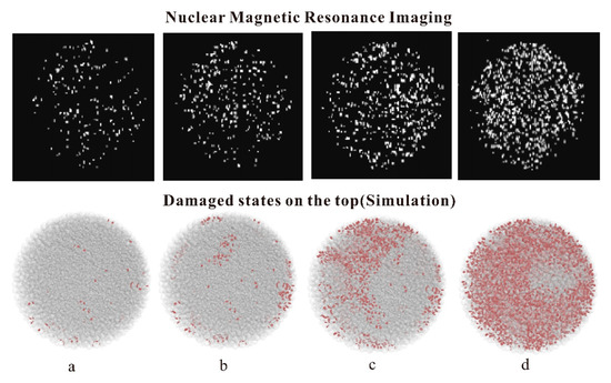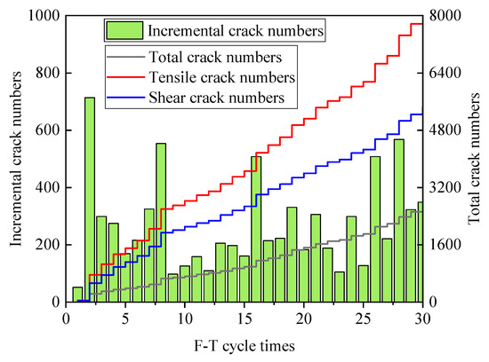 The damage induced by freeze–thaw cycling is progressively accumulated. The damage is considered to arise from the disruption of cementation at the mineral scale, so the whole process of damage development is first counted by the DEM in this paper. Figure 6 and Figure 7 show the process of internal damage accumulation during the freeze–thaw cycling of intact rock samples, and the statistical results of meso-cracks are listed in Figure 8. From a qualitative point of view, we can observe the internal damage intensification process in soft rocks during the freeze–thaw cycles, and the numerical test results are compared with the indoor test results of Liu et al. [66] in Figure 6, and the mesoscopic NMR results of Gao et al. [67] in Figure 7. The qualitative comparison reveals a consistent, overall internal damage development pattern, which proves the effectiveness of the method proposed in this paper.