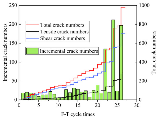 There is no significant damage acceleration in the freeze–thaw cycles for the cracked soft rocks, but we could find several stable and jump processes in the overall damage count. The first jump occurs between 5–10 cycles followed by a period of steady growth. A second sharp increase occurs between 15–20 cycles followed by another sharp increase between 25–30 freeze–thaw cycles.