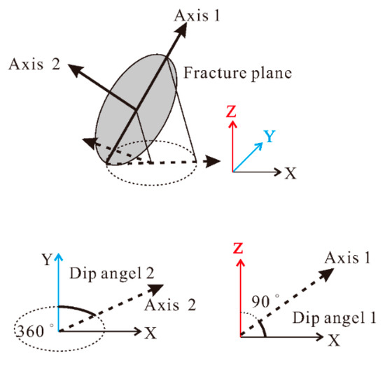 In order to further analyze the evolutionary characteristics of the meso-cracks, the angles at the generation of the mesoscopic cracks are studied in this paper. As shown in Figure 9, the generated meso-cracks are in the equivalent of the disc in the plane state. The crack plane is controlled by two kinds of angles; the first one termed angle-1 is the angle between the crack plane axis and the Z direction, which is 0~90°, and the second one termed angle-2 is the angle between the plane normal axis and the Y axis after projection in the X–Y plane, which is 0~360°.