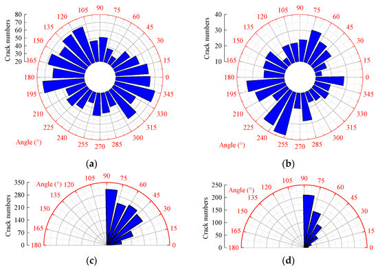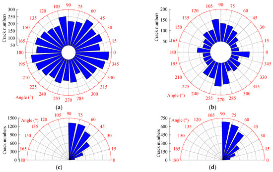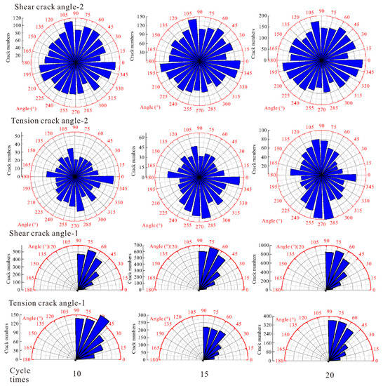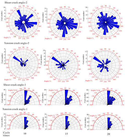 To further analyze the evolution of micro-cracks during freeze–thaw cycling in cracked rocks, we also present the angular relationships in some earlier stages in Figure 17, at cycle times 10, 15 and 20. We can find that there is no obvious difference both in angle-1 and angle-2. These statistical results are relatively stable compared with their counterparts in Figure 11. It is mainly because the number of accumulated cracks in the cracked rock is much higher than in the intact rock.