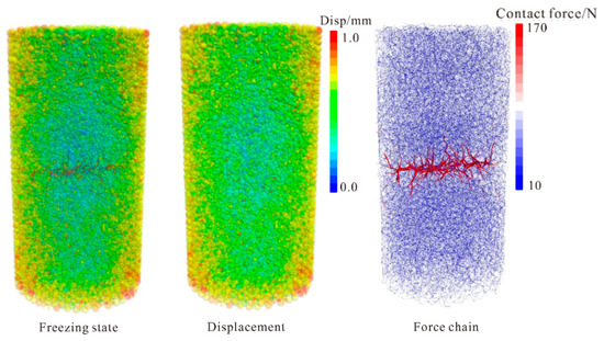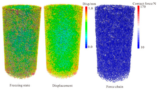 During the freezing process, there is a squeezing effect of the pore ice on the mineral particles of the soft rock specimen, and this phenomenon can be described by the internal contact forces (see Figure 12).