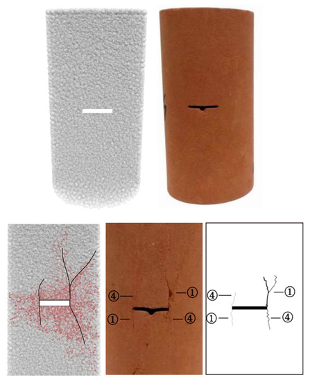 The cracked rock samples were in a damaged state and the results of Liu et al. [68] were selected for the laboratory comparison of the freeze–thaw tests. The macroscopic phenomena revealed that the soft rock specimens produced a damage pattern radiating from the center of the initial crack to the surrounding area at the end of 30 freeze–thaw cycles. The freeze–thaw damage process produced wing cracks near the initial cracks, and this result is consistent with the indoor results (see Figure 14). Therefore, in this paper, the mesoscopic damage characteristics during the freeze–thaw cycling of cracked soft rocks will be analyzed in this section to contrast with intact rock samples.