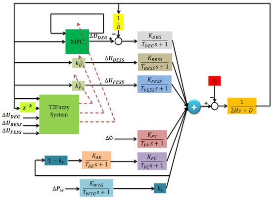 With the increasing consumption of electricity around the world, the electricity industry is facing issues such as the high cost of building new power plants and developing transmission networks, over-distribution and distribution, and environmental concerns. In order to overcome these problems, the reliability of customer service should be increased, congestion and losses in transmission and distribution lines should be reduced, and new and suitable renewable energy sources that have been introduced over the last two decades should be distributed. The benefits of renewable energy sources have led to plans to make more use of them in the electricity industry and to expand microgrids in most countries [1,2,3,4]. Microgrids, which consist of the interconnection of distributed production units and loads, are units that can work in two ways: connected to the grid or islanded. These units have many applications for supplying power to sensitive centers [5]. The main network issues are frequency and power fluctuations, which have received considerable attention both at intervals corresponding to operation and management (which aim to dampen power fluctuations) and at intervals corresponding to frequency control (LFC) [6]. In the case of frequency control, the goal is to quickly dampen fluctuations and to ensure the dynamic performance of the system, so that the fluctuations are in a satisfactory range. Numerous studies have been performed on frequency control in microgrids [7,8,9,10]. The research conducted for controller design has two main categories. The first category is controllers based on conventional methods, and the second category, which has made great progress in recent years, is controllers based on computational intelligence [11,12,13]. Controllers based on proportional-integral control (PI) and proportional-integral-reflective controllers (PID) based on coefficients determined by the Ziegler–Nichols method [14] and fractional order are used to control the frequency of drops in data [15]. One of the methods used to control the load frequency is the robust control method [16,17], H-Infinite Control (H∞) [18]. In [19,20], some methods have been presented based on the evolutionary algorithm and the iteration method.