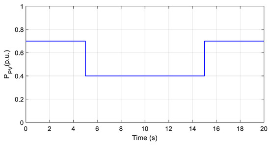 In Equations (4) and (5), and are the gain and the time constant of the solar cell, respectively. is the change in the electric power output of the solar cell, and finally, Also, changes in the intensity of solar radiation are indicated by . The electric power output of the solar cell is calculated as follows:
