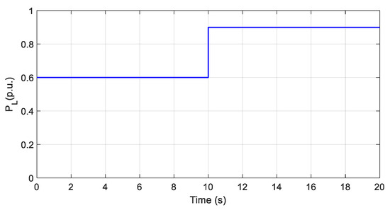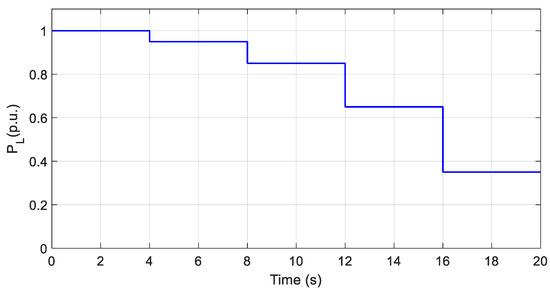 Figure 11 shows the step reduction in the load at every 4 s (the height of each step is twice the previous step). In the first step, the load is reduced from to , and in the last step, the load is reduced from to (critical state in a practical system). As can be seen from Figure 12, the self-tuning MPC performance is much better and faster than that of traditional MPC. Additionally, by observing the magnified area (around ), it is seen that the frequency changes in the T2Fuzzy MPC method are about half that of the T1Fuzzy MPC method.