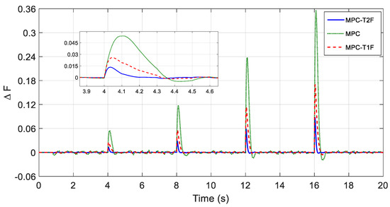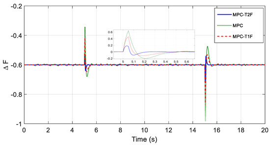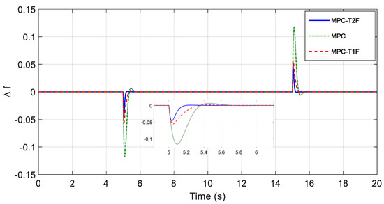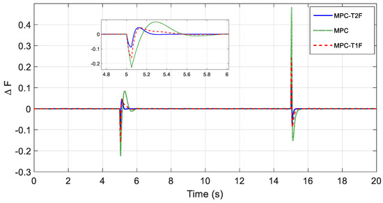 In this scenario, the load increases by at t = 10 s. As can be seen, the frequency change in the T2Fuzzy-MPC method is about 0.15 Hz; in the T1Fuzzy-MPC method, it is about 0.19 Hz; and finally, in the traditional MPC method, it is about 0.38 Hz.