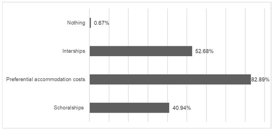 Almost half of the respondents do not know any incentive programs carried out by the city. The most recognizable are students’ scholarships offered by the President of the City of Gdansk. However, to the question related to the actions that the city should undertake to encourage students to settle in the city after graduation, over 80% of respondents indicated preferential accommodation costs as the most needed (Figure 4). Students pointed to internships and scholarships, as well.