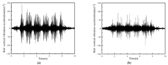 Simulated vibration acceleration of the rail surface: (a) inner rail; (b) outer rail.