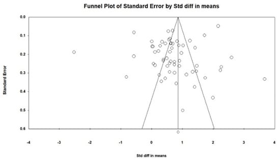 The funnel plot mainly uses visual observation to identify publication bias. It takes the effect size as the abscissa, the ordinate as the standard error, and the two slashes as the 95% confidence interval. Ideally, the interval and the dispersion obtained by small samples are larger; hence it is often at the bottom of the funnel plot, and the dispersion of large samples is smaller and at the top under normal circumstances. The publication bias of the 59 experimental studies included in the meta-analysis was assessed using CMA software, which was graphed as shown in Figure 3. The test results for the funnel plot in Figure 3 are not symmetrical. This study chose Egger’s test slightly more powerful than Begg’s and is more sensitive to small samples. The results showed that t = 1.757 > 1.96, p_1, p_2 < 0.05, further indicating the existence of bias. However, through the analysis of the safety factor, the value of the loss of safety factor is 911, which is much larger than “N × 5 + 10”. Therefore, publication bias exists to a certain extent, but it is still safe.