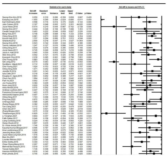 Among the included literature, 22 reported significant, statistically significant effects, and 13 had an effect size greater than 1. The forest map can be drawn using CMA software. See the forest plot for details, as shown in Figure 4.
