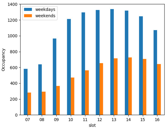 Occupancy of parking lots at different time slots during weekdays and weekends.