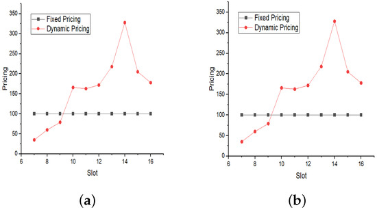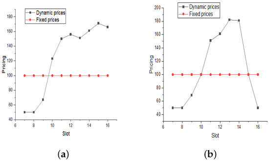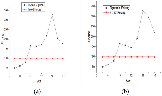 Dynamic prices vs. static prices for different time slots. (a) Near shopping mall. (b) Near corporate building.