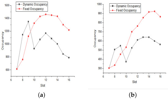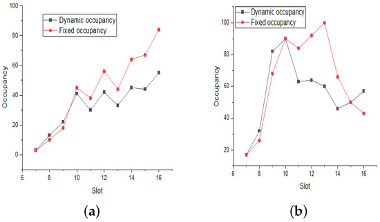 Dynamic occupancy vs. static occupancy for different time slots. (a) Near shopping mall. (b) Near corporate building.