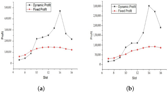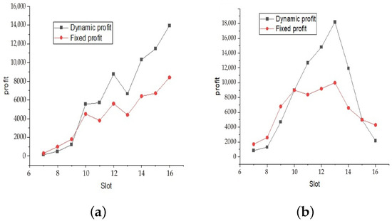 Dynamic prices profit vs. static prices profit for different time slots. (a) Near shopping mall. (b) Near corporate building.