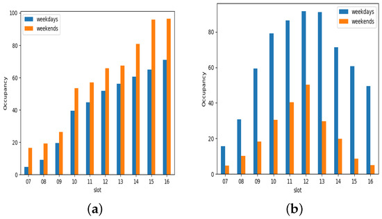 Occupancy of parking lots at different time slots during weekdays and weekends. (a) Near shopping mall. (b) Near corporate building.