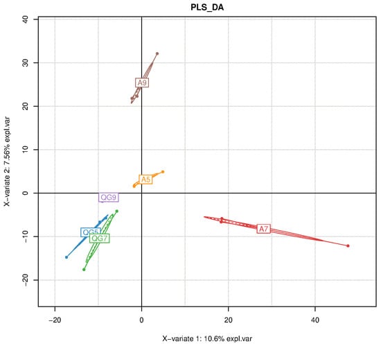 PLS-DA (partial least squares discriminant analysis) of fungi in apple orchards planted with alfalfa cover crops. Note: QG, Orchard clean tillage. A, Ground cover with alfalfa green manure in apple orchards. The numbers 5, 7, and 9 indicate the month of sampling.