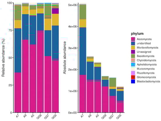 Nine fungal phyla were discovered in the soil samples (Figure 3). The top three most relative abundant phyla were Ascomycota (42.62–71.81%), Basidiomycota (2.42–13.2%), and Mortierellomycota (2.21–7.83%). Ascomycota was the most dominant phylum. In May, treatment A had a higher relative abundance of Ascomycota than treatment QG, but it had a lower relative abundance in July and September (p < 0.05). The dominant phyla in terms of absolute abundances of Ascomycota were A5 > QG5, A7 > QG7, and A9 > QG9. The absolute abundance of Ascomycota in the A treatment was higher than the QG treatment at the 0–20 cm, 20–40 cm, and 40–60 cm soil depths and increased 187.60%, 130.18%, and 22.71%, respectively. Ascomycota showed the highest abundance at 1.74 × 106 in treatment A7. The absolute abundance of Mortierellomycota was higher in treatment A than treatment QG. Alfalfa cover crops increased the copy numbers of fungi in the 0–20 cm, 20–40 cm, and 40–60 cm soil layers, particularly in July. The alfalfa cover crop inhibited the dominant phylum Ascomycota.