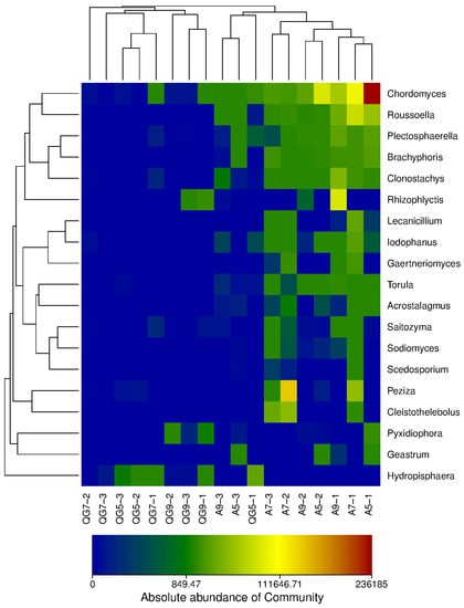 Heatmap analyses of the top 10 fungi in apple orchards planted with alfalfa cover crops at the genus level. Note: QG, Orchard clean tillage. A, Ground cover with alfalfa green manure in apple orchards. The numbers 5, 7, and 9 indicate the month of sampling. The numbers −1, −2, and −3 indicate the depth of the soil samples.