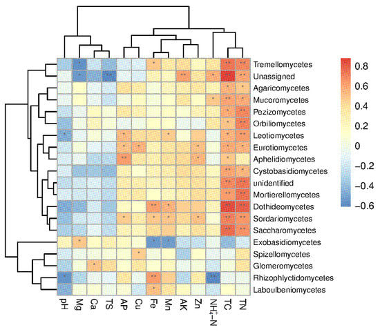 Heatmap of the Pearson correlation analyses between the fungal community at the class level and soil factors. Note: TN, total nitrogen. TC, total carbon. AP, available phosphorous. AK, available potassium. TS, total salt. NH4+-N, alkali-hydrolyzable nitrogen. “*” indicates significant difference, and “**” indicates extremely significant difference.