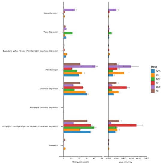 Comparison of fungal functional groups based on their relative abundance and absolute abundance. Note: QG, Orchard clean tillage. A, Ground cover with alfalfa green manure in apple orchards. The numbers 5, 7 and 9 indicate the month of sampling. ANOVA, * p < 0.05, ** p < 0.01, *** p < 0.001.