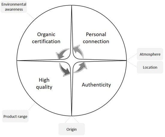 The interview partners also listed other aspects, such as atmosphere, location, origin, product range, or environmental awareness. However, these primarily support the already described main factors. Comparing the results with the previous literature, it becomes obvious that visiting organic wineries provides an experience with a strong hedonic nature. It contains the dimensions entertainment, education, and aesthetics [39]. Our findings are in line with this model. A personal connection and superior wine quality belong to entertainment, organic certification to education and location, and atmosphere to aesthetics.