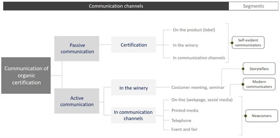 In the case of communication about wine tourism–related topics, organic certification appears even more infrequently. The interviewed winery operators explained that the organic logo appears on every website, printed documents, and the product (label). Therefore, it is part of the communication strategy. However, a logo is a visual sign that does not directly explain organic winemaking. That is why wineries emphasized the importance of organic certification, mainly in face-to-face conversations with consumers during meetings and seminars in the winery or at an event. This is not an “in advance” communication, but education in the winery when tourists are there or at events and fairs when consumers visit the stand. According to their communication styles, the wineries can be classified into four different types: (1) Storytellers combining organic winemaking with other information and spreading the stories mainly through word-of-mouth, (2) self-evident communicators purposely deciding not to communicate organic certification directly because they are convinced that the logo already tells visitors the difference from conventional wineries, (3) modern communicators, particularly using web pages and social media channels, to spread information about the organic certification of the winery, and (4) newcomers that have been certified recently and are carefully starting to communicate the organic character of the winery.