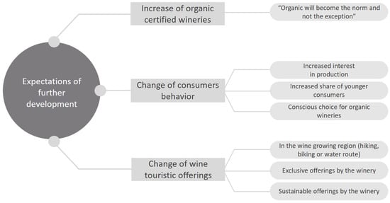 Organic wineries expect a change in consumer behavior in the coming years. They expect an increasing interest in wine production and, at the same time, a kind of curiosity and a critical attitude towards wine production. In addition, a higher share of younger consumers and a more conscious way of choosing organic wines are positive indicators that wineries mentioned during their interviews. Age has already been mentioned as an influencing factor, e.g., by [14], who stated that organic certification has become more and more important among young adults.