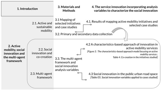 After the Introduction, the paper is organized into three sections. Section 2 sets up the main concepts addressed and provides the theoretical framework of the paper. It discusses active mobility, social innovation, and the multiagent framework. Section 3 focuses on the empirical context and the methodology used. Section 4 displays the results, highlighting the multiagent framework for service innovation incorporating the nine variables used to characterize social innovation (Figure 1).