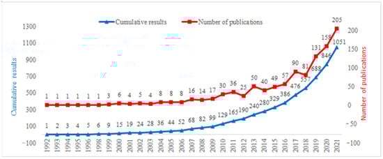 The number of published documents reflects progress in developing a field of research from a given perspective. Following the data collection and identification, a total of 1051 papers were obtained; their chronological distribution and corresponding cumulative results were used to establish a statistical chart of the number of papers related to green ports (Figure 1).