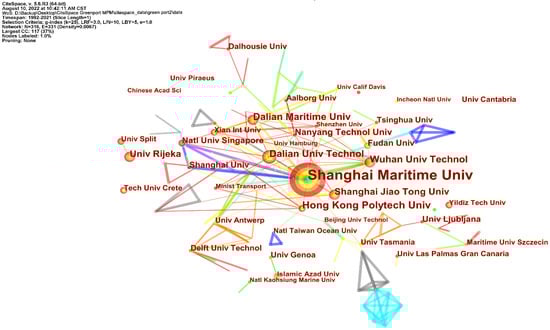 The difference in the number of publications among countries (regions) reflects, to some extent, the different levels of interest in green port research. By analyzing the collaborative networks among countries/regions, it was possible to identify priority countries/regions that generate high numbers of publications and have a significant impact on the research field; additionally, the collaborative relationships among these entities can be identified. In CiteSpace, the time period was set to 1992–2021 with an interval of 1 year, the node type was country or region, and the labeling parameter was G-Index = 25. Calculations were performed with the results to obtain a country/region cooperation map (Figure 2) and visualize the collaborations among institutions (Figure 3).