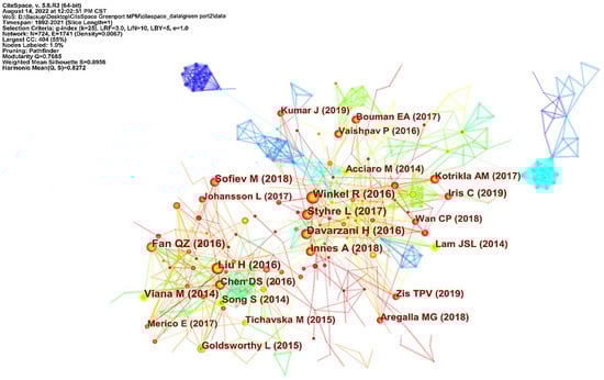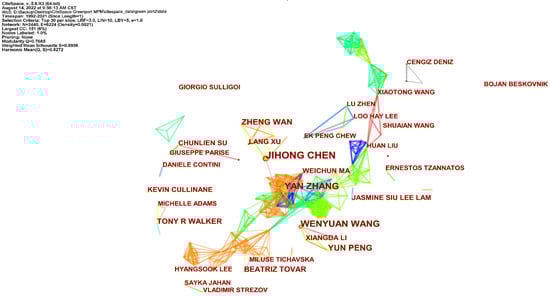 As presented in Table 4, the authors with the highest number of research outputs are Jihong Chen (15), followed by Wenyuan Wang (12), Yan Z Hang (12), Yun Peng (9), Zheng Wan (8), Tony R Walker (7), Beatriz Tovar (7), and Jasmine Siu Lee Lam (7). As a social network, the author writing network is important for processes, such as creating and sharing knowledge. The cooperative network generated by CiteSpace is presented in Figure 4. Each author is a network node, and the cooperation among authors is denoted by connections. The larger a node in the map, the more frequently the corresponding author published papers, and the greater the number of connections they have, the higher their frequency of collaborating with other authors. The degree of clustering in the author collaboration networks is typically used to obtain the density of the resulting visual network, i.e., the ratio of the actual number of connections in the network to the number of theoretical connections in the ideal state of the same network: