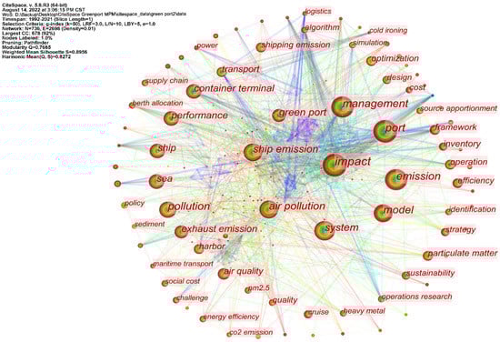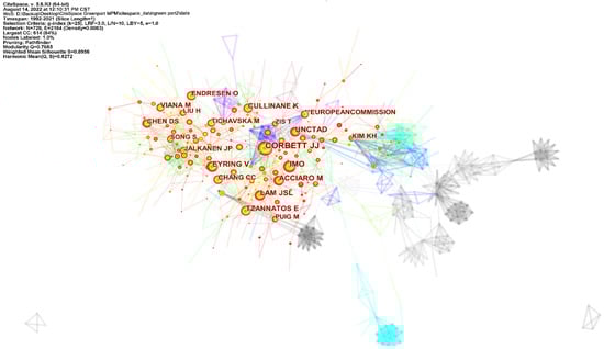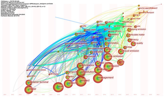 The most common citation among authors was Corbett JJ (frequency = 148). For example, in “The effectiveness and costs of speed reductions on emissions from international shipping”, the policy implications of fuel taxes and deceleration directives in the context of CO2 emissions were explored [95]. A second common reference among authors was Eyring V (frequency = 85) [96], who established ship emissions algorithms for 2006 and two future scenarios involving fuel consumption in 2050 and emissions and the ship traffic density in 2010. Moreover, Corbett JJ collaborated with Eyring V to publish “Transport impacts on atmosphere and climate shipping.” The contributions of gas and particulate matter emissions from ocean transport to anthropogenic emissions and air quality were assessed, as were the deterioration of human health and climate changes caused by these emissions. Lam J. S. L. (frequency = 84) [97] was the third most commonly cited author and co-published “The Greening of Ports A Comparison of Port Management Tools Used by Leading Ports in Asia and Europe”, which involved port management tools owned by ports/public authorities. The extent to which these tools were implemented or encouraged during port operation and development was then analyzed.
