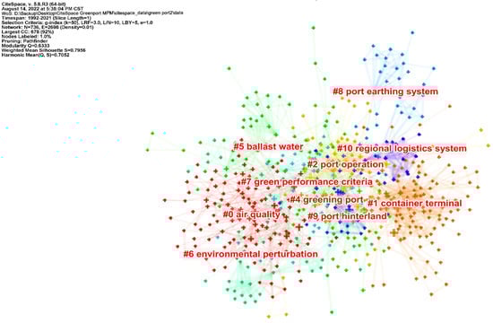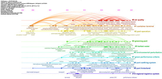 CiteSpace provides three algorithms for computing cluster labels: LSI, LLR, and MI. Studies have shown that the cluster recognition of the LLR algorithm is relatively representative and comprehensive, and the keyword clustering function is ideal [39]. Therefore, this algorithm was the focus of the cluster mapping of the keywords of green port studies (Figure 8), where Q = 0.6333 (greater than 0.3) indicated that the cluster column was reliable and the profile value S = 0.7956 (greater than 0.5) indicated that the structure was reasonable. Invalid clusters (e.g., hazardous cargo vessels), ten in total, were removed. The contour values of the keyword clusters ranged from 0.715 for cluster #4 to 0.973 for cluster #10. The size of the largest cluster (#0) was 126 papers and the size of the smallest cluster (#10) was 17 papers. Figure 9 shows a timeline of keyword co-occurrence networks related to green port research. Table 5 shows clusters of keywords in green port research. The 10 clusters were divided into three categories to assess the research on green ports and best understand the results of the cluster analysis.