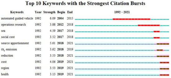 CiteSpace provides a burst detection function to detect keywords, and a sudden detection of keywords usually indicates that a research field has changed, reflecting the research frontier in the field [39]. A time-line visualization of keywords can be used to clearly and intuitively visualize the evolution and development of keyword clusters and word sets in different time periods, identify research trends, and clearly assess the evolution and mutation of words. Figure 10 shows a timeline diagram of green port research, with time as the horizontal coordinate, presenting the evolution of keywords in the temporal dimension and illustrating the characteristics of the research field in each phase from 2002 to 2021. To analyze the current research trends, we selected the relevant studies from the past 10 years, set the time interval to one year, and applied the burst detection function in CiteSpace [20]. The node type was “Keyword”, the selection criterion was “in the top 25”, and a mutation analysis of keywords was performed. The first 10 variants of the intensity of the change were obtained (Figure 11). The start and end times of mutations in the graph represent mutation cycles (represented by red lines). Keyword burst analysis is a useful tool for identifying the research directions that have received substantial attention over time [131]. In this case, the keywords “automated guided vehicle” displayed the greatest mutation intensity (value 6.08), followed by “green logistics.” The longest mutation time was 11 years, and the keywords for the most recent mutations were “reduction”, “source apportionment”, and “region”.