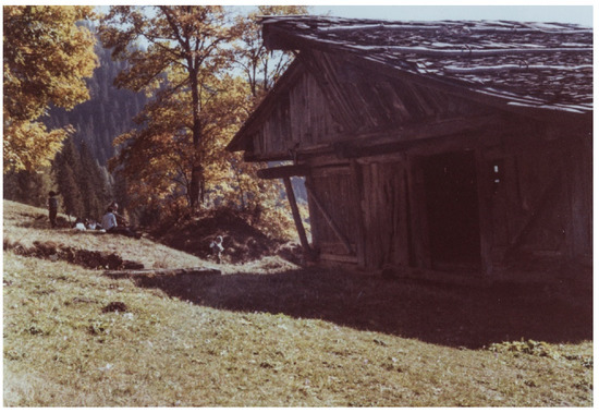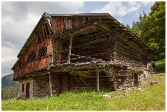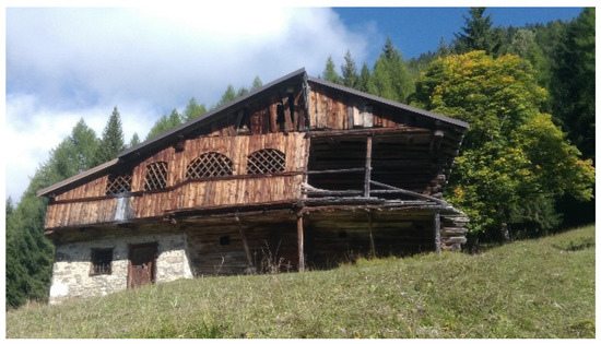 Many historical papers have documented that the Mas di Sabe was acquired by several families which succeeded over the years. Although the area has many other private barns, the Mas di Sabe is considered to be unique. Compared to the other high-rise barns, it presents a unique shape that makes it appear shorter and broader due to several extensions that have been realized through the years. It is the older tabià of the area and the only one with the upper part composed of trunks that have been assembled according to the unique blockbau technique (Figure 5), and a lower base made of stone.