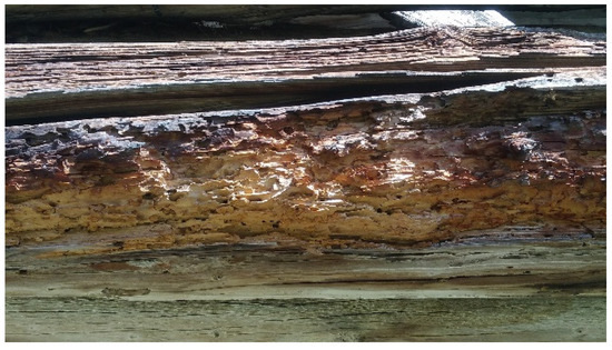 Currently, the state of the building is of severe degradation worsened by atmospheric agents, such as snow, that challenge its existence every year (Figure 7). Specifically, the most damaged part is the wooden one, which is rotten and consumed by woodworms (Figure 8). On the other hand, the vast field surrounding the ancient barn is kept by a local farm that regularly cuts it, using the resulting hay to feed its livestock.