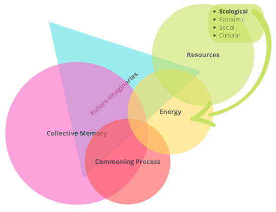 Linked to the collective management of common goods such as historical buildings, [26] suggested using the term ‘commoning’ instead of ‘commons’ since it better describes a social practice constantly in the making. Because it expresses the relationships in society, the term ‘commoning’ helps understand how communities manage resources by defining their use, production, and circulation [27].