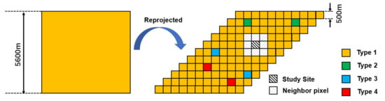 The schematic diagram of the selection of study sites. (The study site and neighbor pixels are type 1, which is the major type of 5600 m pixel).