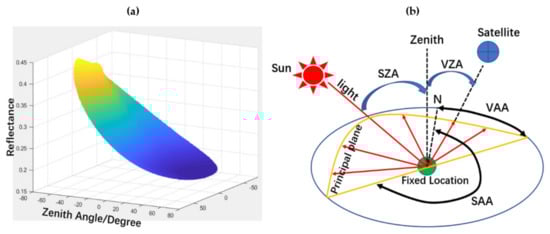 BRDF expresses the heterogeneity of surface directional reflection through incident-view geometry, which is of significance for correcting the angular effect of surface reflectance and improving the inversion accuracy of land surface parameters, such as albedo. For MODIS-BRDF, the AMBRALS is the operational algorithm based on the kernel driven and linear Rossthick-LisparseR model [,,]. In general, the MODIS-BRDF model can be operated in two ways: forward and inverse modes. In the forward mode, the surface reflectance under a fixed incident-view geometry can be obtained by the BRDF model parameters. In the inverse mode, the BRDF model parameters can be fitted by the surface reflectance under various incident-view geometries. Thus, we selected the forward mode to obtain the surface reflectance for various directions based on the BRDF parameters. As BRDF is the continuous function in three-dimensional space, its unique feature and the spatial distribution brought challenges to the quantitative assessment (Figure 3a). The BRDF principal plane is determined by the incident light from the sun and outgoing light to the satellite that intersected at a fixed location (Figure 3b). The BRDF principal plane can not only reflect the angle effect brought by the incident-view geometry, but also implies typical anisotropy features, such as hot spots, dark spots and zenith spots. We utilized the research version of AMBRALS provided by Boston University to retrieve the BRDF principal plane from backward −70° to forward 70°. Backward is the side with the sun; forward is the side without the sun.