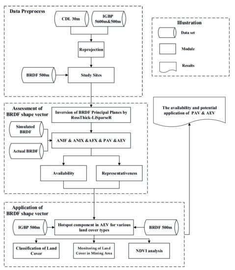 As BRDF is a complex three-dimensional surface, it is always a challenge to describe its features with some parameters. Thus, researchers have tried to describe the shape of BRDF by shape indicators based on the ratio of some typical directions for BRDF or the weight coefficient for different scattering effects. Some studies have shown that it is a potential and feasible way to describe the shape of BRDF and retrieve land parameters by shape indicators [,,,,]. Among these classical BRDF shape indicators, some are constructed to extract parameters or identify categories of land cover; these factors do not have indications for the shape of BRDF, such as NDAX and SSI. The NDAX is the normalization of ANIX in the red and NIR band, while SSI is constructed by the volumetric parameter in the NIR band and the geometric parameter in the red band []. However, ANIF (Equation (1), λ is spectral band, is the reflectance of zenith, is the reflectance of forward 45°), ANIX (Equation (2), is the reflectance of backward −45°) and AFX (Equation (3), 0.189184 and 1.377622 are the integral value in two hemispheres for the RossThick and LiSparseR kernel) could directly describe the shape of BRDF. Thus, we utilized three classical shape indicators (ANIF, ANIX and AFX) to describe the shape of BRDF quantitatively compared with the shape vectors (PAV and AEV) proposed by this study. The workflow of this paper is shown in Figure 4.