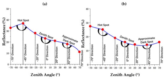 Anisotropy affects directional reflectance, which results in the variation of reflectance for fixed surfaces and disturbs the information for land cover. Due to anisotropy, the variation of NDVI based on multi-angle reflectance for fixed land surfaces could be as high as 12–25% []. For crops in mature stages, the relative differences of vegetation indexes obtained from multi-angle observations may exceed 50% []. Thus, anisotropy should be normalized to weaken or eliminate the influence [,,]. In addition, anisotropy also enriches the reflected information of fixed land surfaces. Gao used the heterogeneity of directional reflectance in NIR and Red band to detect the types and structures of land cover []. Wang utilized anisotropic remote sensing data and airborne Lidar to obtain structure parameters of forests in a large area []. Land surface parameters or categories could be identified accurately by the algorithm founded by anisotropic theory [,,,,]. Thus, anisotropy is of great significance for detecting spatial structures and retrieving the parameters of land cover.