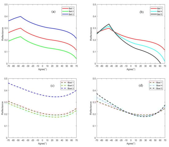 The BRDF principal planes based on simulated data. (a,b) The BRDF principal planes with Bell shapes; Bell 1 to Bell 5 correspond to the Data Modes 1 to 5 of Bell shapes in Table 1; (c,d) the BRDF principal planes with Bowl shapes; Bowl 1 to Bowl 5 correspond to the Data Modes 1 to 5 of the Bowl shapes in Table 1.